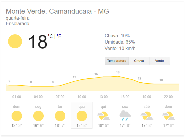 De acordo com o site weather.com1, podemos esperar para essa quarta-feira (23/05) em Monte Verde máxima de 18 graus celsius e mínima de 8 graus. O Outono veio forte em Monte Verde, e tudo indica que teremos muitos dias de baixas temperaturas no Inverno que vem pela frente! 1Dados obtidos em 20/05/18.